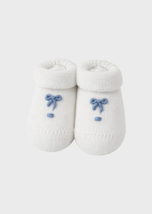 Babbucce in filo di cotone 100% Made in Italy base bianco con delicato fiocco nodo d’amore ricamato azzurro petalo. La lavorazione artigianale italiana garantisce morbidezza e traspirabilità eccezionali per i piedini delicati del neonato durante la nascita e le prime uscite. Il fiocco nodo d’amore ricamato a mano in tonalità azzurro petalo aggiunge un tocco […]